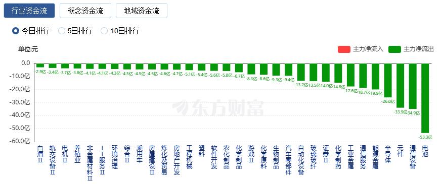 净流出方面,电池、通信设备、元件等净流出排名靠前,其中电池净流出53.34亿元。