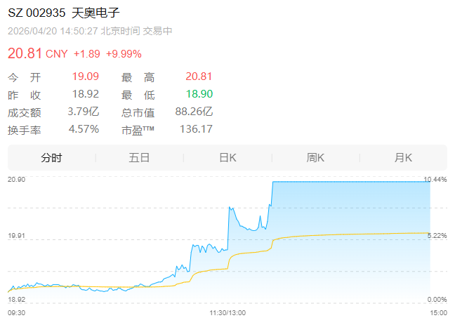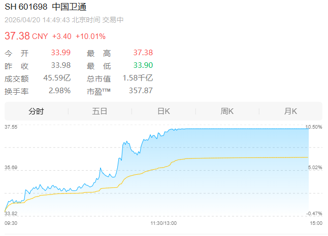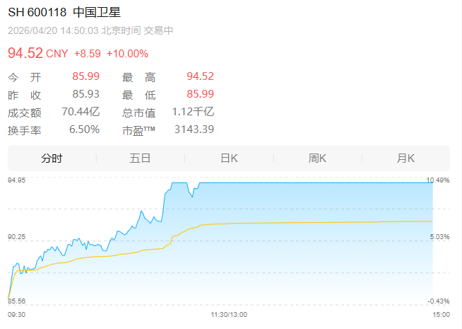 【大河财立方消息】4月20日,A股商业航天概念午后持续拉升,中国卫通、中国卫星、天奥电子等近20只个股涨停,博云新材6连板,航天电子、航天环宇、海格通信等跟涨。