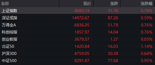 截至收盘,A股重要指数悉数飘红。上证指数涨0.78%,深证成指涨0.59%,创业板指微跌0.03%,科创综指涨0.76%。全市场超3400只个股上涨。