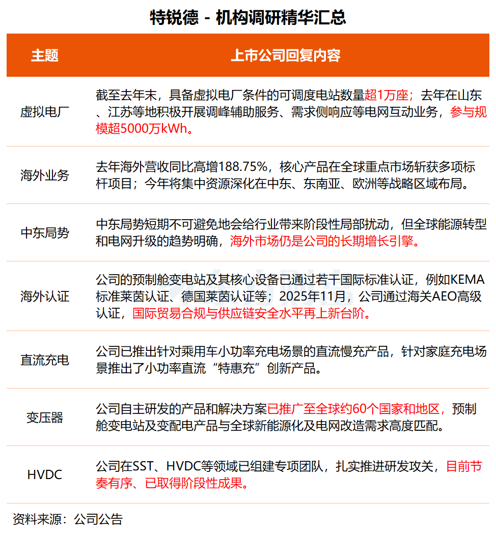 在调研中,特锐德表示,公司自主研发的产品和解决方案已推广至全球约60个国家和地区,公司预制舱变电站及变配电核心产品与全球新能源化及电网改造需求高度匹配。
