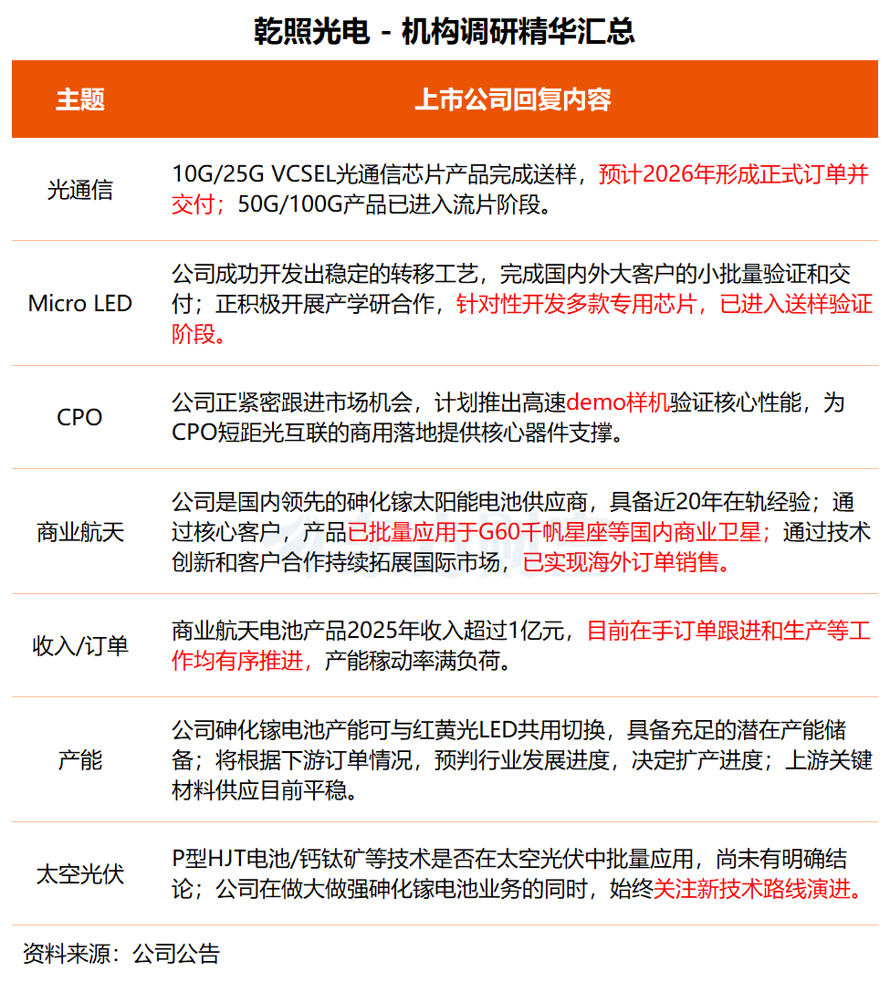 另据介绍,2025年,公司商业航天电池产品收入超过1亿元,目前在手订单跟进和生产等工作均有序推进,产能稼动率满负荷;目前暂没有钙钛矿电池相关布局。公司将积极把握商业航天市场机遇,优化砷化镓电池生产效率。