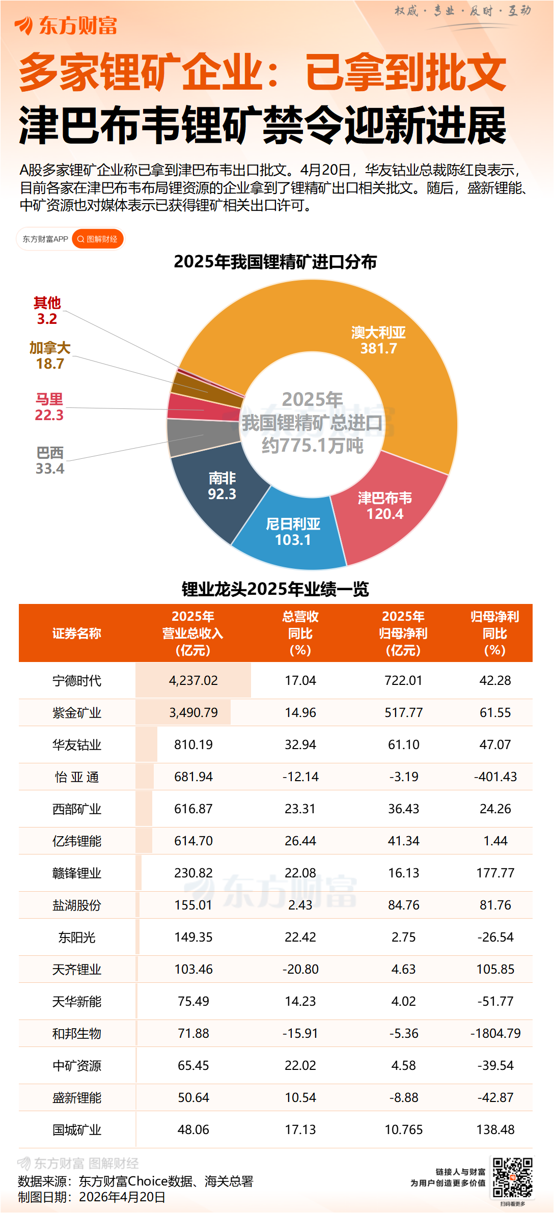 4月20日,在华友钴业2025年度暨2026年第一季度业绩暨现金分红说明会上,公司总裁陈红良表示,目前各家在津巴布韦布局锂资源的企业拿到了锂精矿出口相关批文,具体都在走流程中。华友钴业在津巴布韦主要有锂精矿、硫酸锂两类产品。出口程序全部完整后,到国内周期约需3个月。公司广西碳酸锂原料可能面临短缺,但不会造成重大影响。