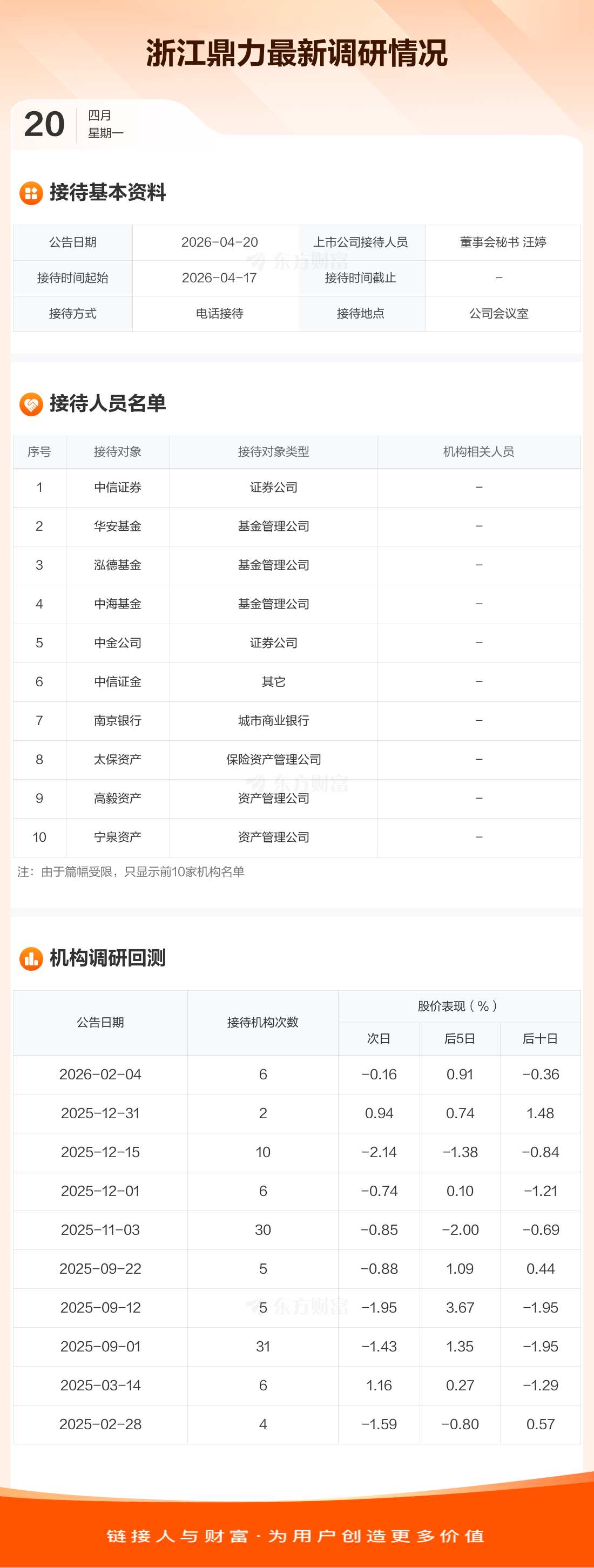 浙江鼎力4月20日公告称,4月17日接待中信证券等20家机构调研。接待人员包括董事会秘书 汪婷。