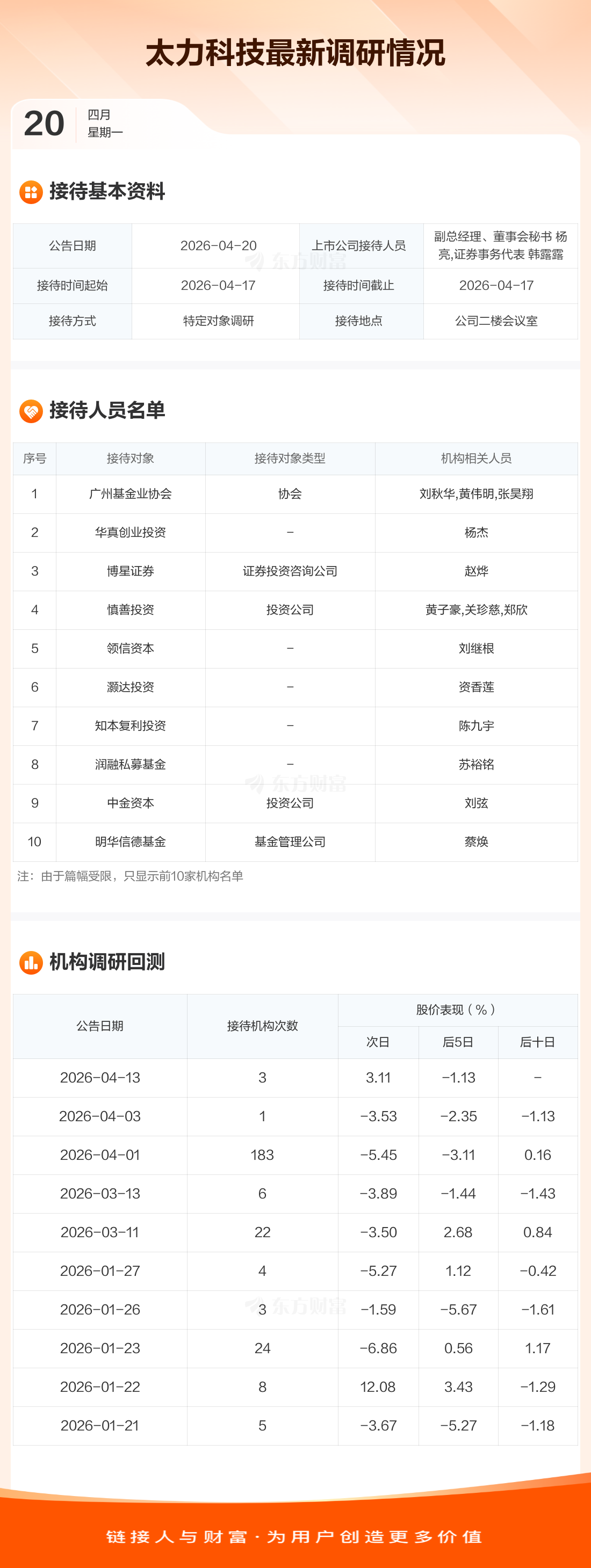 太力科技4月20日公告称,4月17日接待广州基金业协会等14家机构调研。接待人员包括副总经理、董事会秘书 杨亮,证券事务代表 韩露露。