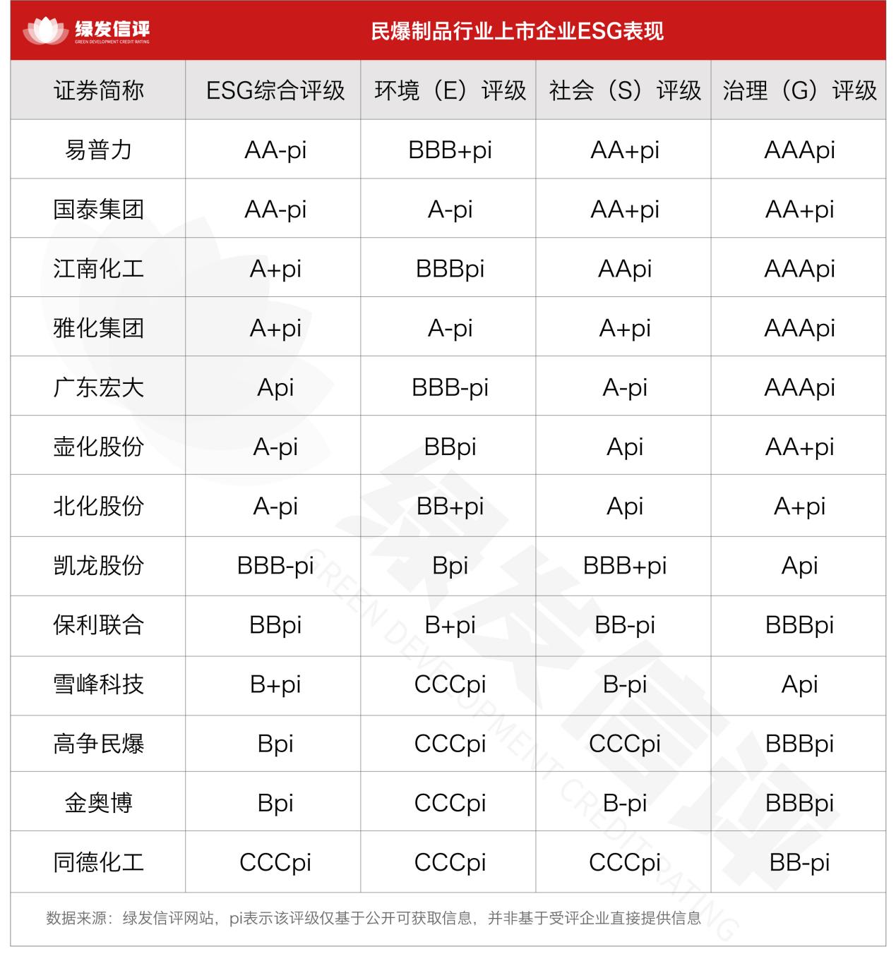 具体来看,易普力和国泰集团获得AA-pi评级,领跑行业;江南化工和雅化集团获得A+pi评级;广东宏大获得Api评级;壶化股份和北化股份获得A-pi评级;凯龙股份获得BBB-pi评级,其余企业评级集中在BBpi及以下,其中同德化工获得CCCpi评级。