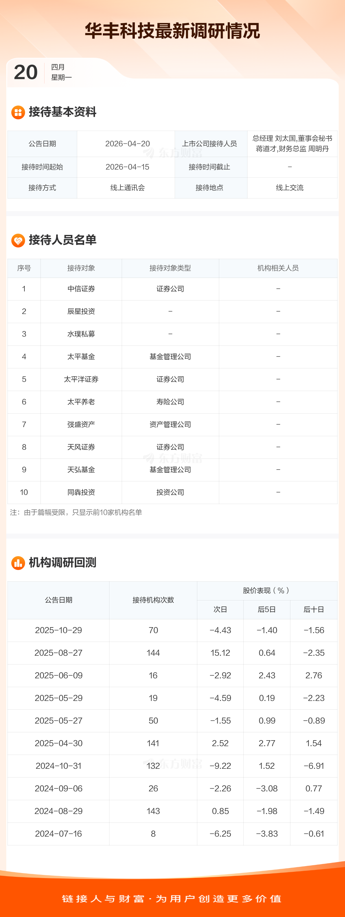 华丰科技4月20日公告称,4月15日接待中信证券等163家机构调研。接待人员包括总经理 刘太国,董事会秘书 蒋道才,财务总监 周明丹。