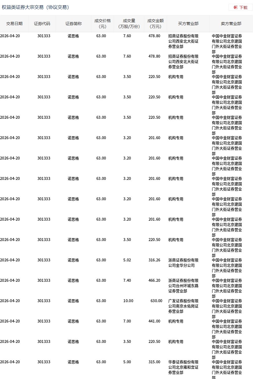 诺思格今日大宗交易折价成交83.12万股,成交额5236.56万元