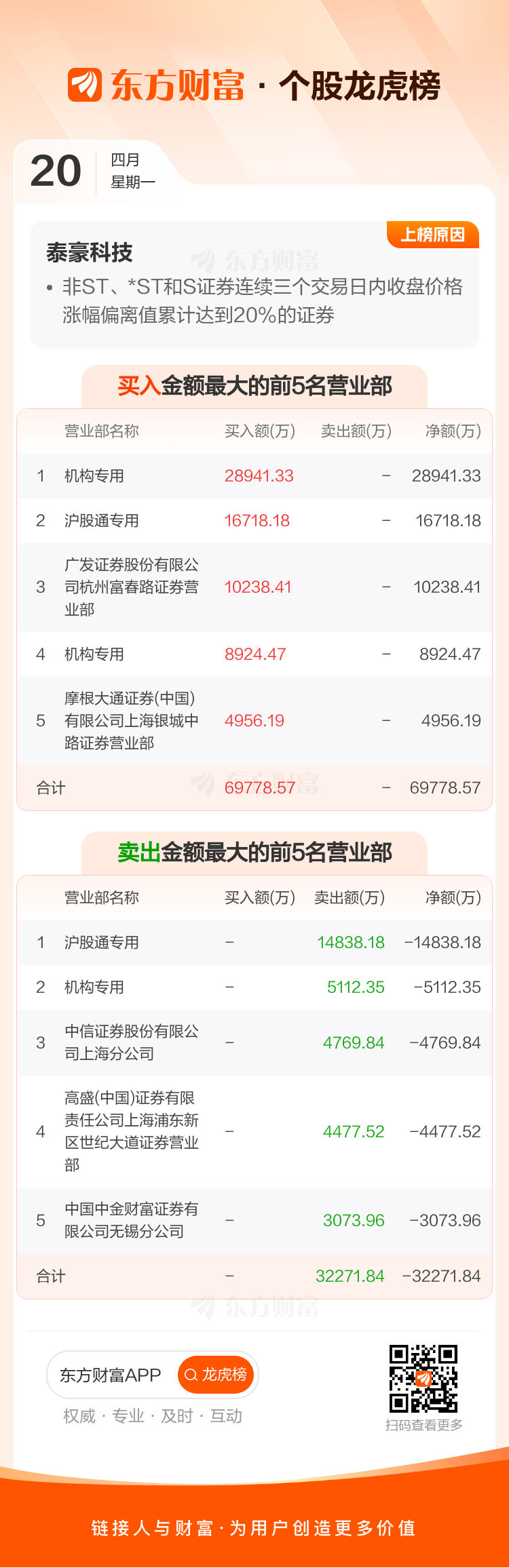 交易所2026年4月20日公布的交易公开信息显示,泰豪科技因成为非ST、*ST和S证券连续三个交易日内收盘价格涨幅偏离值累计达到20%的证券上榜。泰豪科技当日收报17.42元,涨跌幅9.97%,换手率4.83%,成交额7.08亿。异常期间4月16日至4月20日,期间涨幅22.50%,累计偏离值21.14%,区间成交额34.62亿。