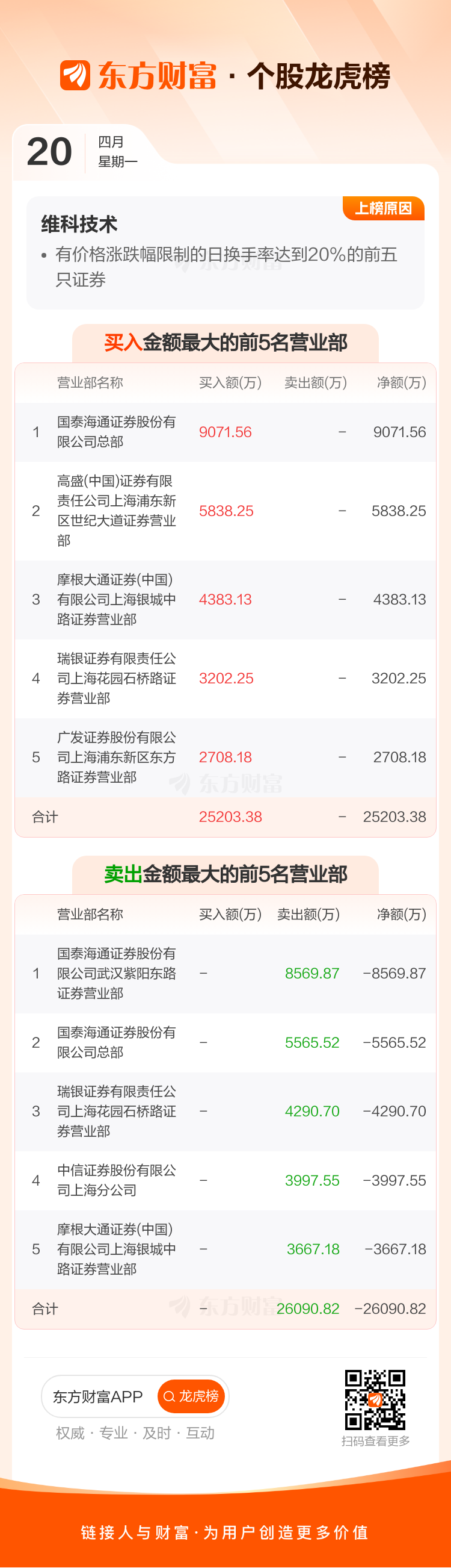 交易所2026年4月20日公布的交易公开信息显示,维科技术因成为有价格涨跌幅限制的日换手率达到20%的前五只证券上榜。维科技术当日收报13.93元,涨跌幅0.22%,偏离值25.89%,换手率25.89%,成交额19.57亿。