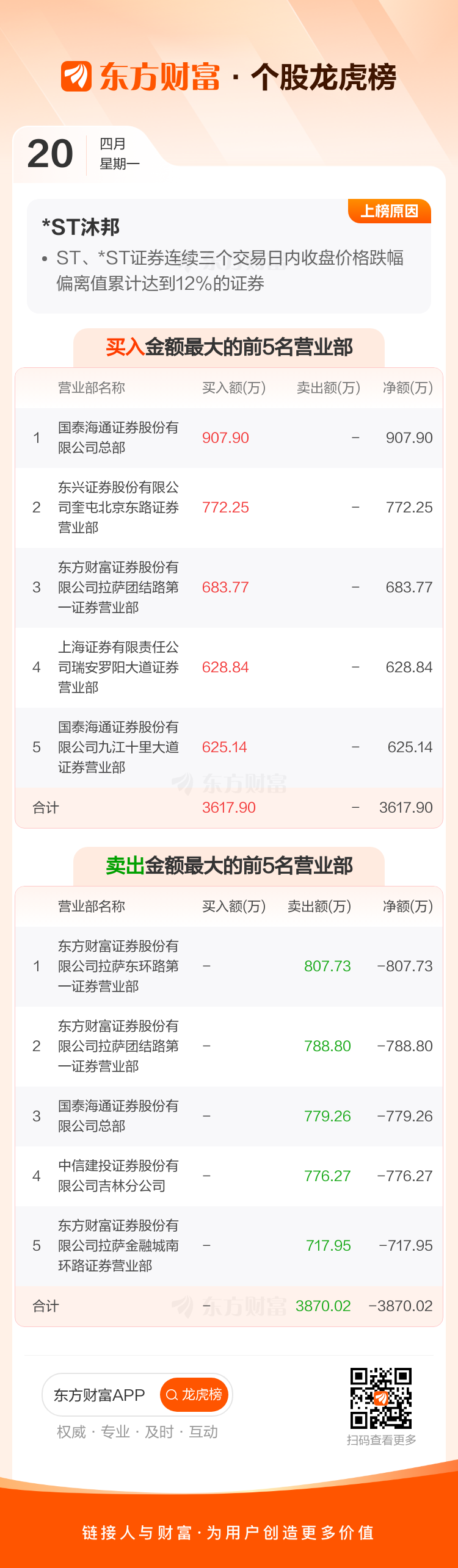 *ST沐邦(603398)龙虎榜数据(04-20)