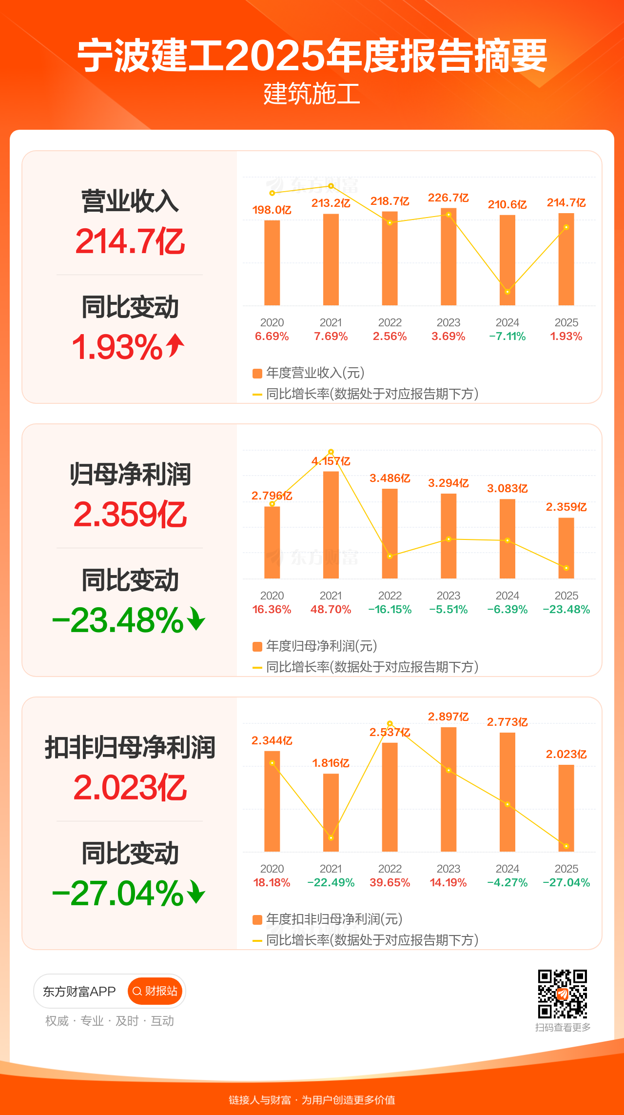 宁波建工4月21日发布2025年年报显示,公司全年实现营业收入214.67亿元,同比增长1.93%;归母净利润2.36亿元,同比下滑23.48%;扣非归母净利润2.02亿元,同比下滑27.04%。