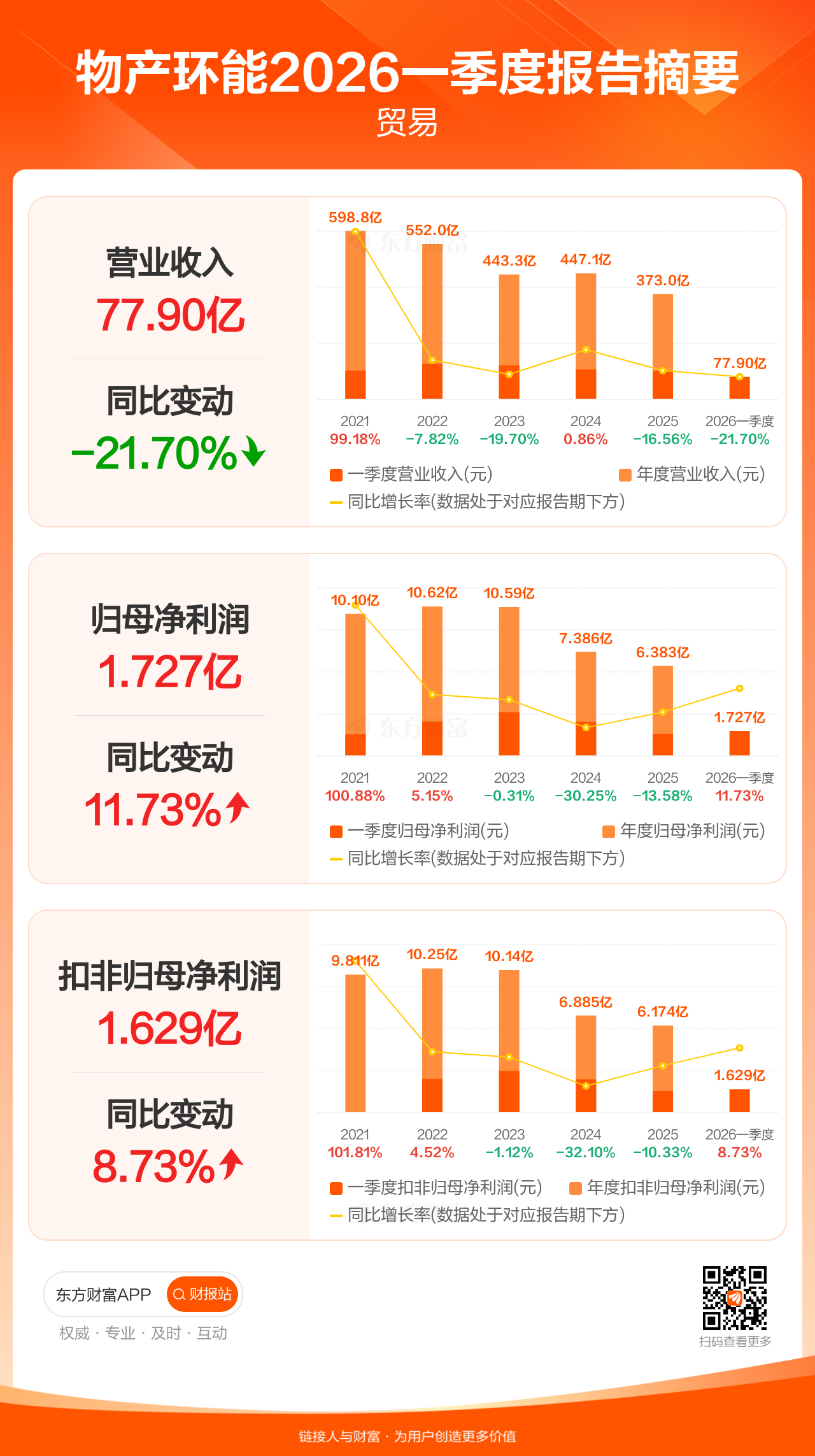 物产环能4月21日发布2026年一季报显示,公司一季度实现营业收入77.90亿元,同比下滑21.70%;归母净利润1.73亿元,同比增长11.73%;扣非归母净利润1.63亿元,同比增长8.73%。