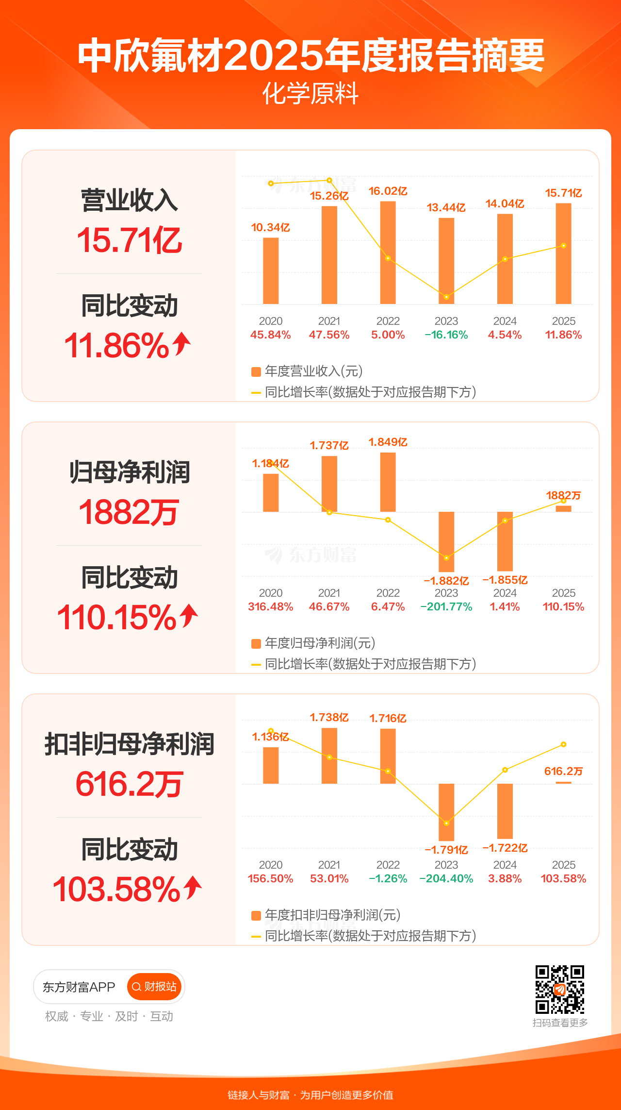 中欣氟材4月21日发布2025年年报显示,公司全年实现营业收入15.71亿元,同比增长11.86%;归母净利润1882.26万元,同比增长110.15%;扣非归母净利润616.23万元,同比增长103.58%。