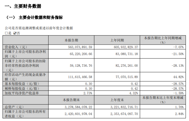 联科科技(001207)一季报显示,公司2026年第一季度实现营业收入5.63亿元,同比下降7.07%;归属于上市公司股东的净利润6522.02万元,同比下降21.50%;扣非净利润5912.87万元,同比下滑28.13%。