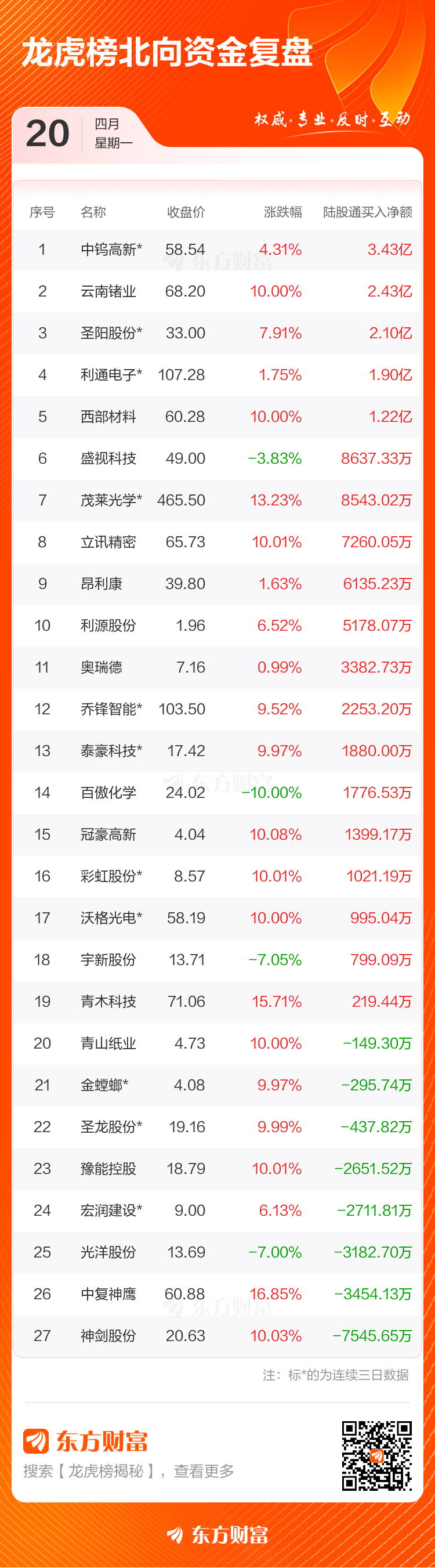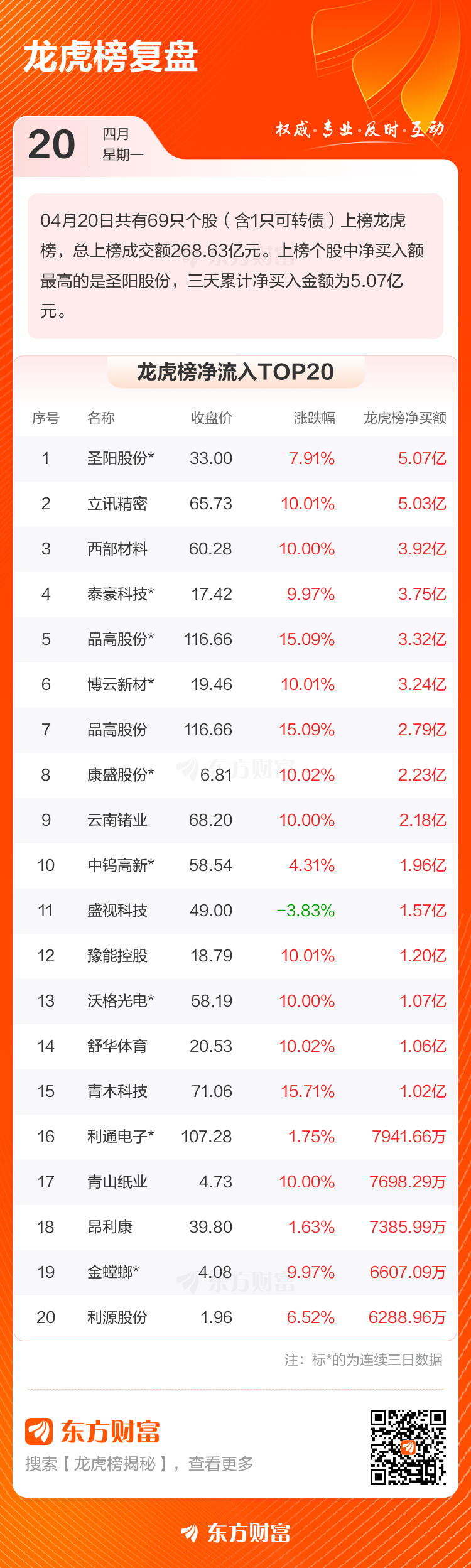 4月20日龙虎榜复盘:圣阳股份净买额居首