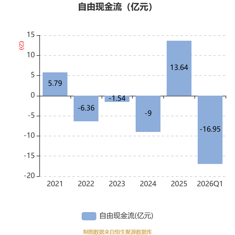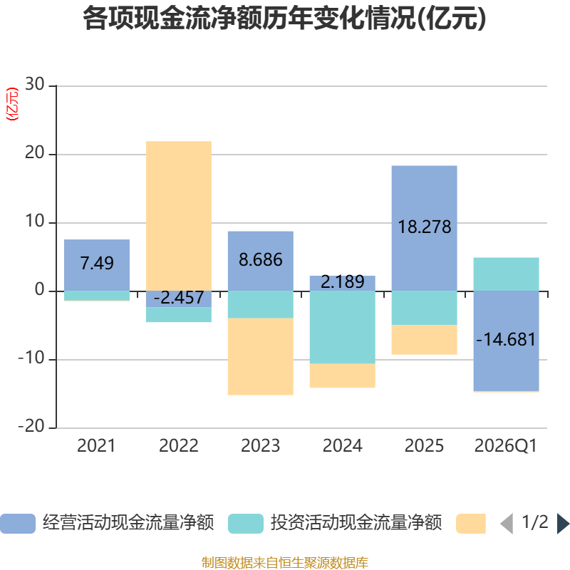 截至2026年一季度末,公司经营活动现金流净额为-14.68亿元,同比减少5.85亿元;筹资活动现金流净额-1858.97万元,同比减少3.55亿元;投资活动现金流净额4.84亿元,上年同期为8742.15万元。