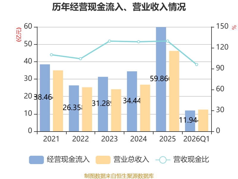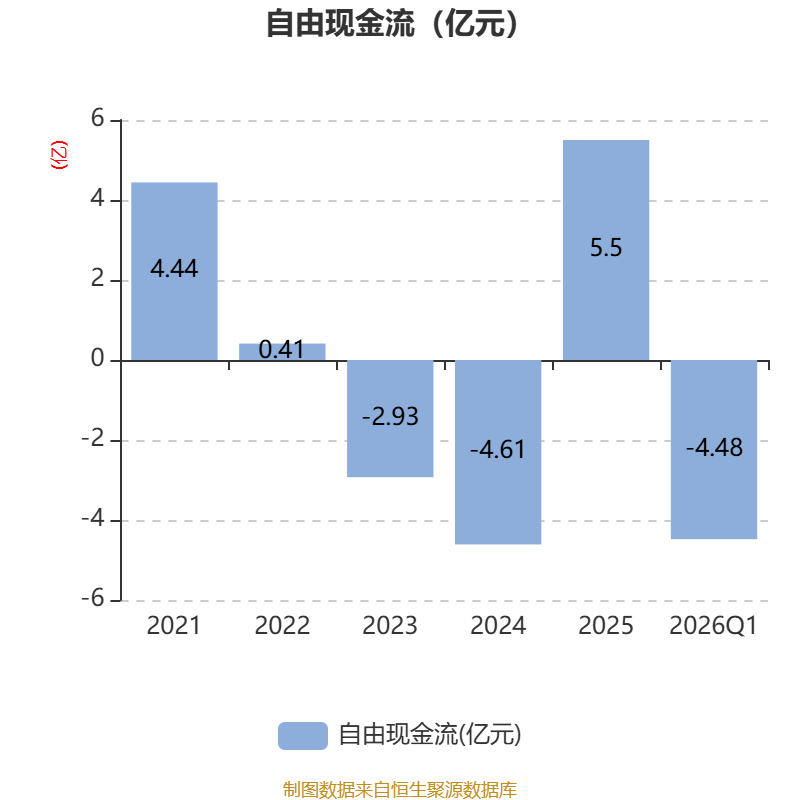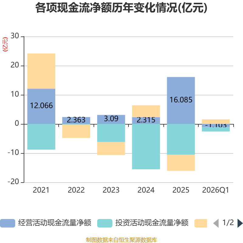 截至2026年一季度末,公司经营活动现金流净额为-1.1亿元,同比减少1.52亿元;筹资活动现金流净额1.55亿元,同比减少1.75亿元;投资活动现金流净额-1.49亿元,上年同期为-3.06亿元。