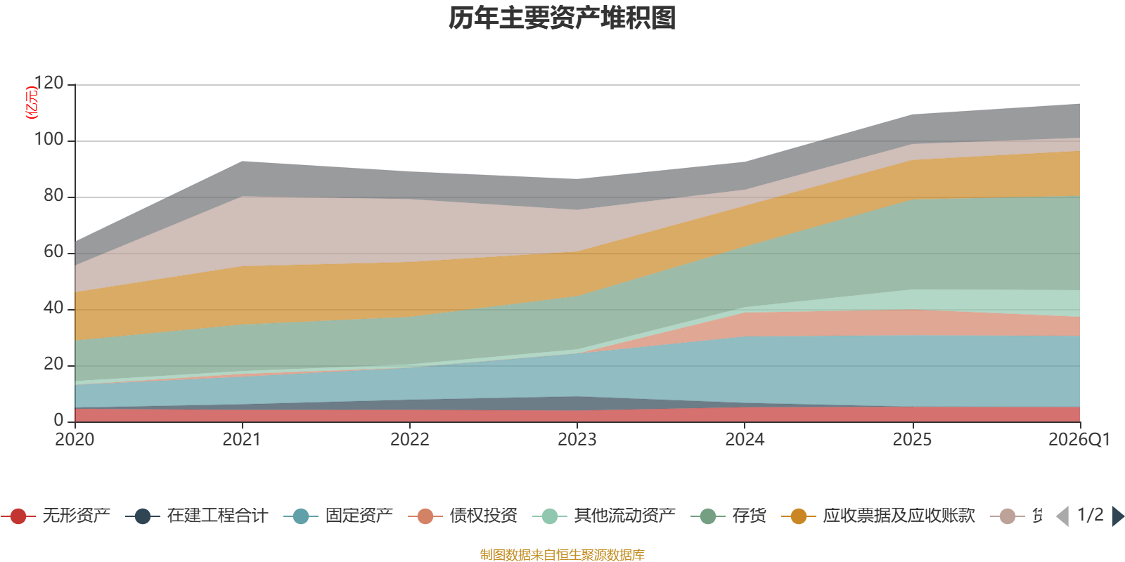 资产重大变化方面,截至2026年一季度末,公司债权投资较上年末减少26.07%,占公司总资产比重下降2.4个百分点;其他流动资产较上年末增加33.08%,占公司总资产比重上升1.87个百分点;应收票据及应收账款较上年末增加13.61%,占公司总资产比重上升1.26个百分点;货币资金较上年末减少18.49%,占公司总资产比重下降1.11个百分点。