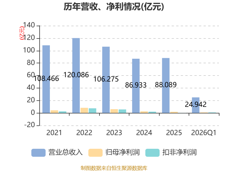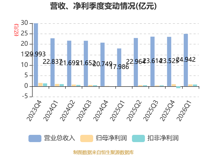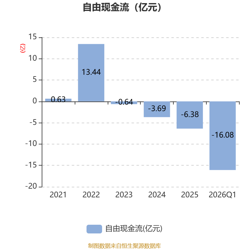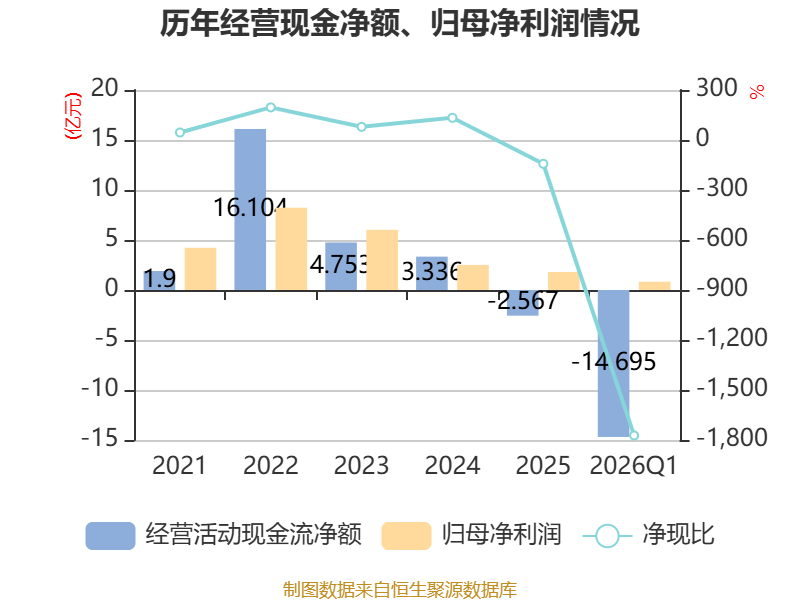 截至2026年一季度末,公司经营活动现金流净额为-14.69亿元,同比减少15.79亿元;筹资活动现金流净额13.93亿元,同比增加14.95亿元;投资活动现金流净额-5529.6万元,上年同期为-9530.96万元。