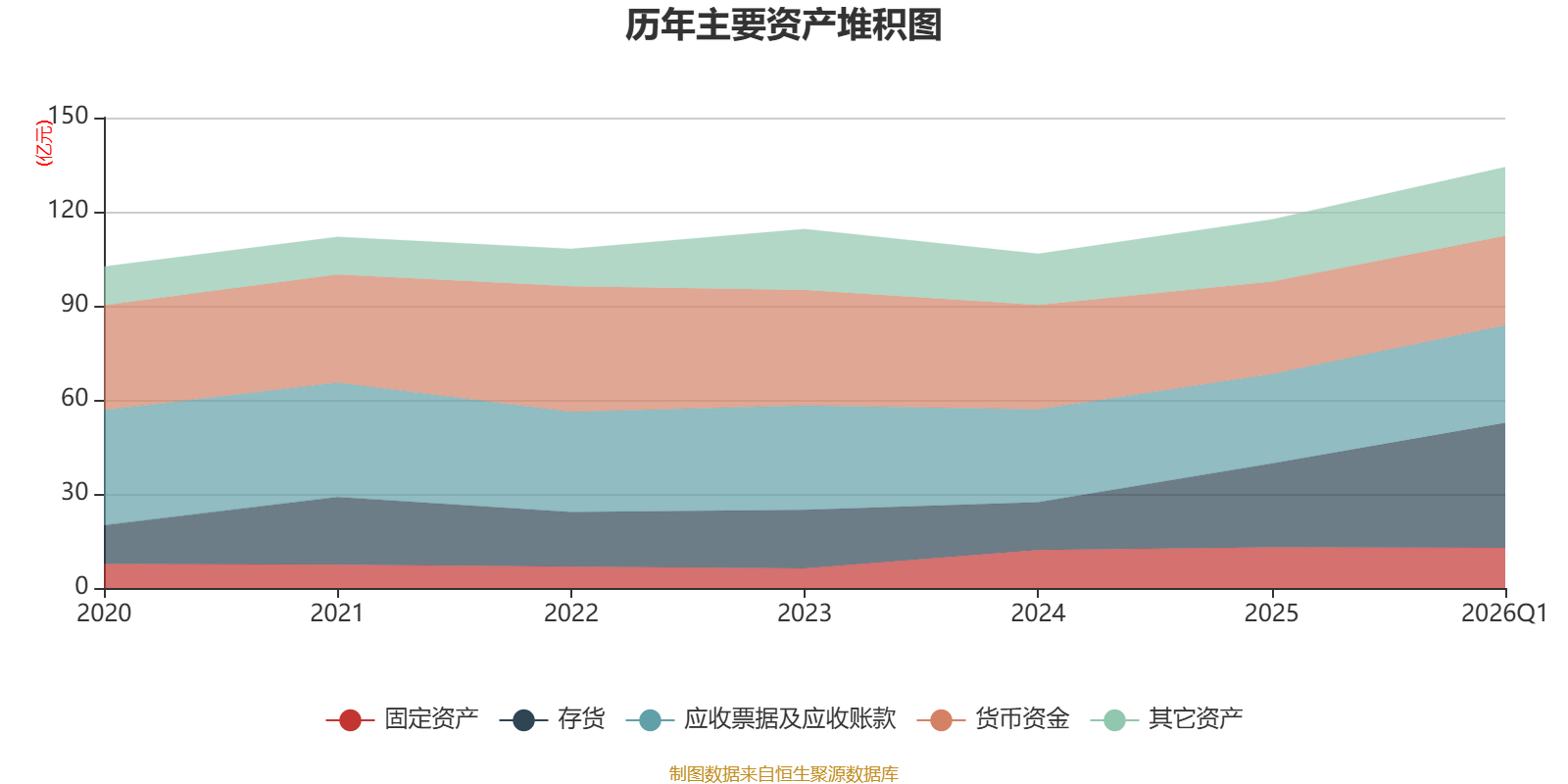 资产重大变化方面,截至2026年一季度末,公司存货较上年末增加49.05%,占公司总资产比重上升6.93个百分点;货币资金较上年末减少3.2%,占公司总资产比重下降3.83个百分点;固定资产较上年末减少1.21%,占公司总资产比重下降1.49个百分点;应收票据及应收账款较上年末增加9.1%,占公司总资产比重下降1.09个百分点。