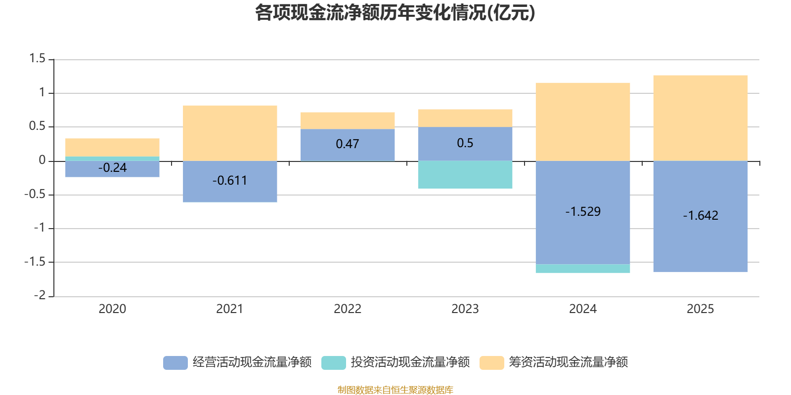 2025年,公司经营活动现金流净额为-1.64亿元,同比减少1139.1万元;筹资活动现金流净额1.26亿元,同比增加1085.9万元;投资活动现金流净额29.6万元,上年同期为-1269万元。