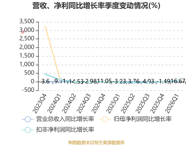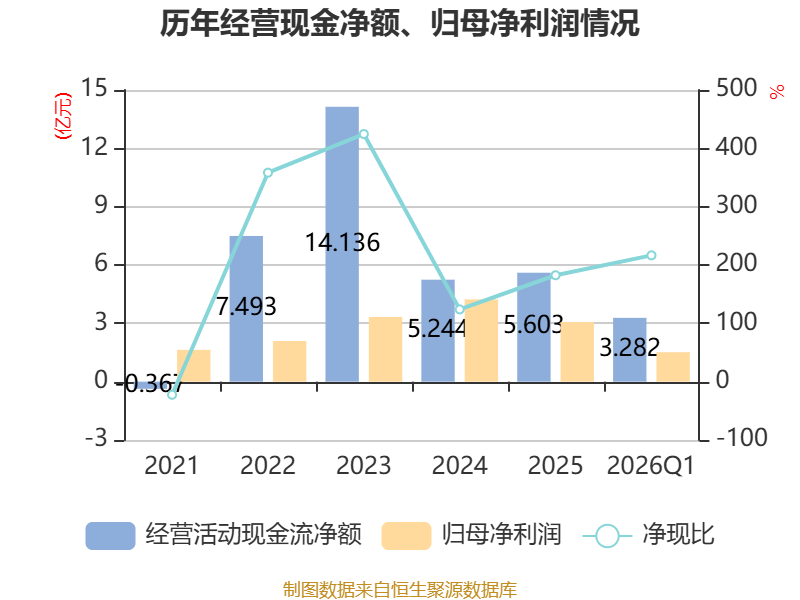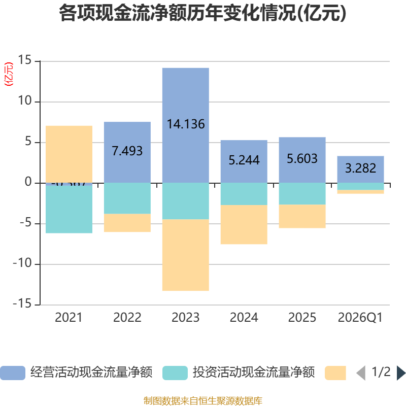 截至2026年一季度末,公司经营活动现金流净额为3.28亿元,同比下降5.74%;筹资活动现金流净额-4493.83万元,同比减少3192.39万元;投资活动现金流净额-9090.04万元,上年同期为-3387.29万元。
