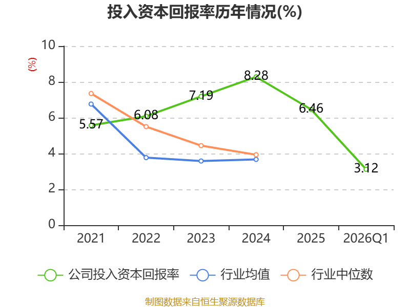 盈利能力方面, 2026年一季度公司加权平均净资产收益率为4.19%,同比上升1.51个百分点。公司2026年第一季度投入资本回报率为3.12%,较上年同期上升1.16个百分点。