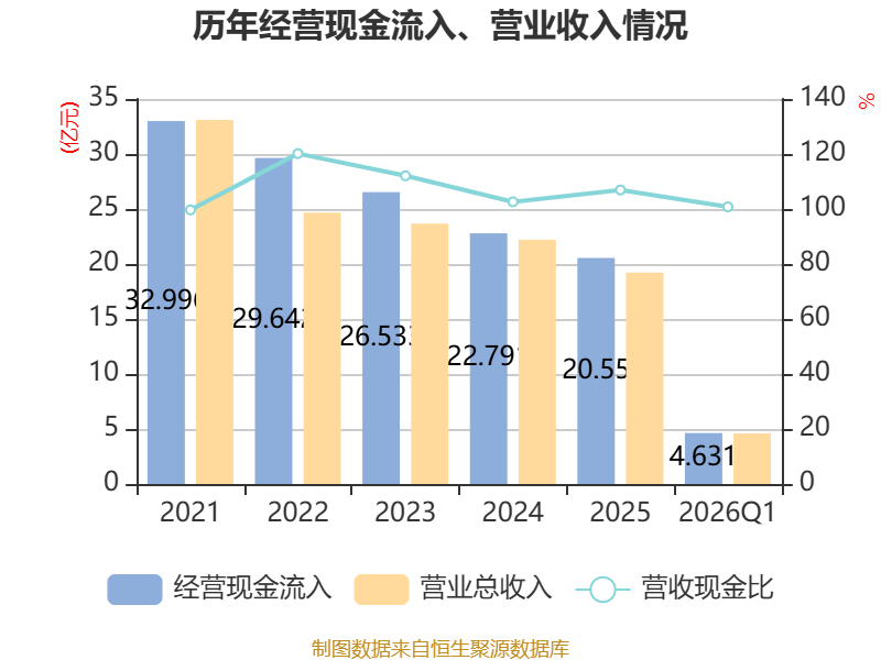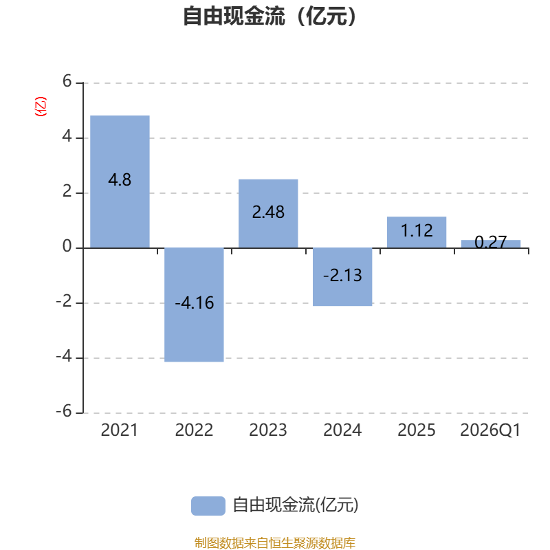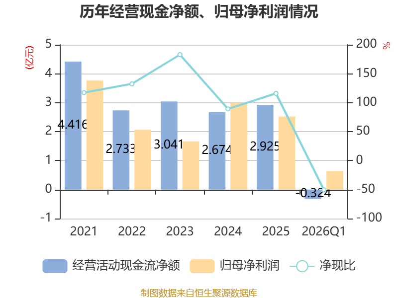 截至2026年一季度末,公司经营活动现金流净额为-3242.42万元,同比减少8393.72万元;筹资活动现金流净额1.85亿元,同比增加4.91亿元;投资活动现金流净额6485.84万元,上年同期为1.32亿元。