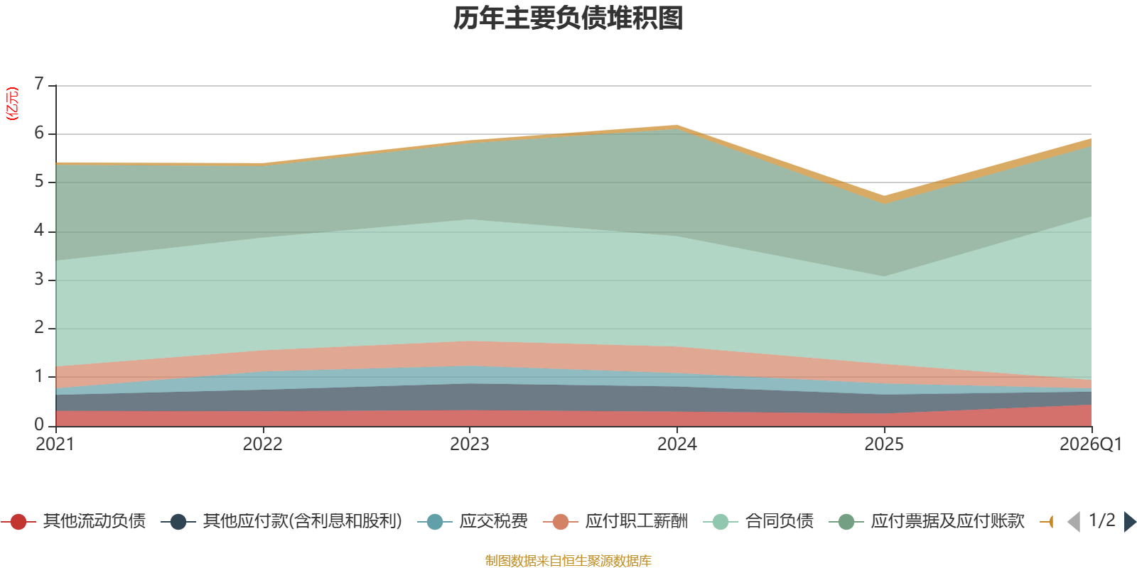 负债重大变化方面,截至2026年一季度末,公司合同负债较上年末增加86.85%,占公司总资产比重上升6.49个百分点;应付职工薪酬较上年末减少56.51%,占公司总资产比重下降1.14个百分点;应交税费较上年末减少69.28%,占公司总资产比重下降0.77个百分点;其他流动负债较上年末增加70.32%,占公司总资产比重上升0.73个百分点。