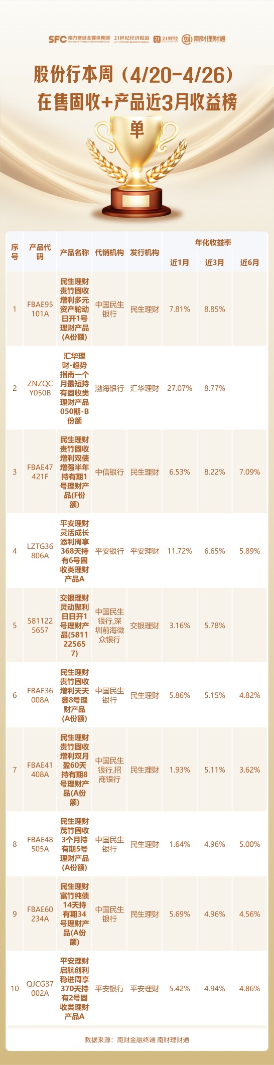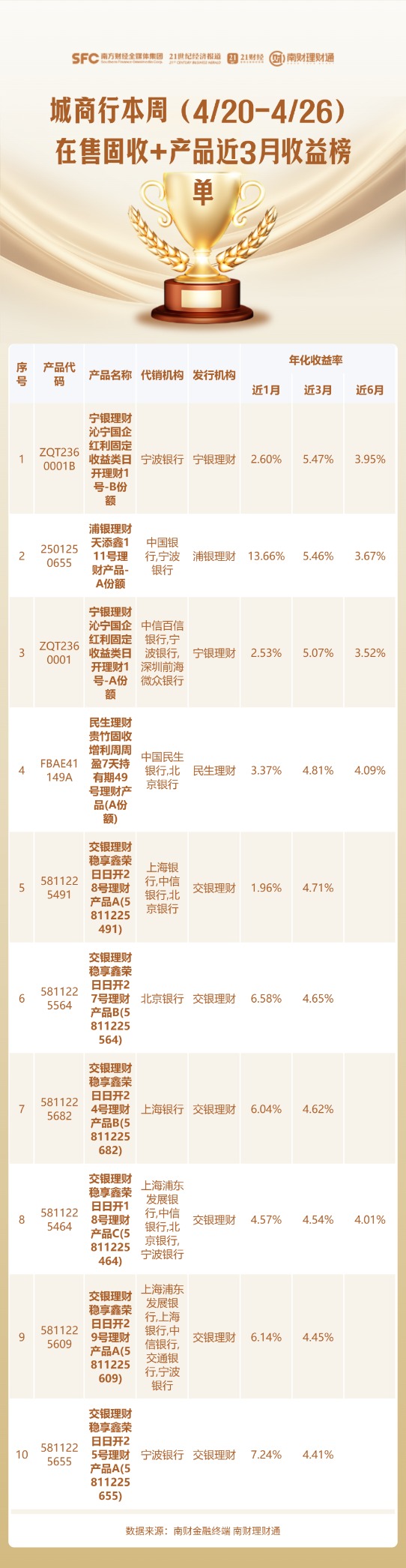 本期,课题组重点关注理财公司发行的混合类产品,从代销渠道为投资者筛选出表现较优的在售产品。收益数据统计截至2026年4月17日。