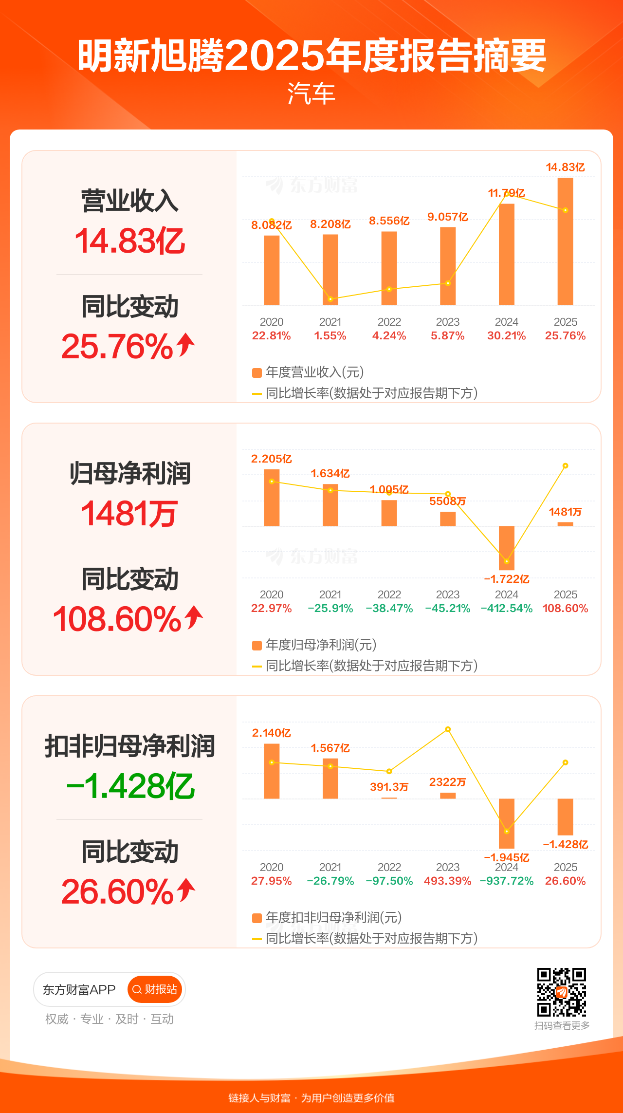 明新旭腾4月21日发布2025年年报显示,公司全年实现营业收入14.83亿元,同比增长25.76%;归母净利润1481.09万元,同比增长108.60%;扣非归母净利润-1.43亿元。