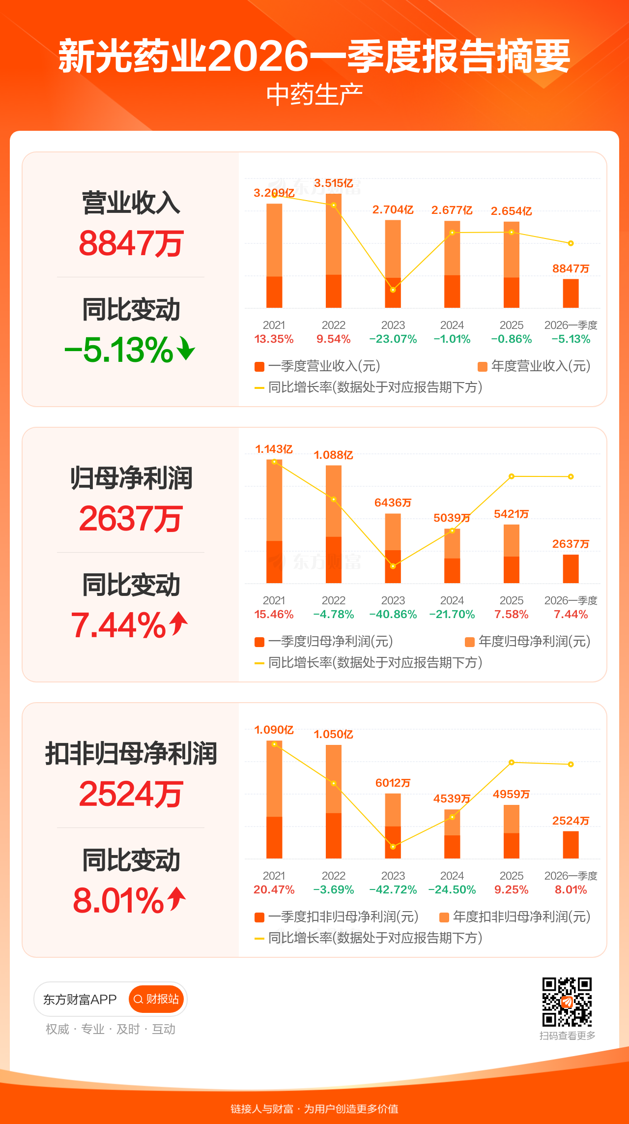 新光药业4月21日发布2026年一季报显示,公司一季度实现营业收入8846.93万元,同比下滑5.13%;归母净利润2636.80万元,同比增长7.44%;扣非归母净利润2523.85万元,同比增长8.01%。