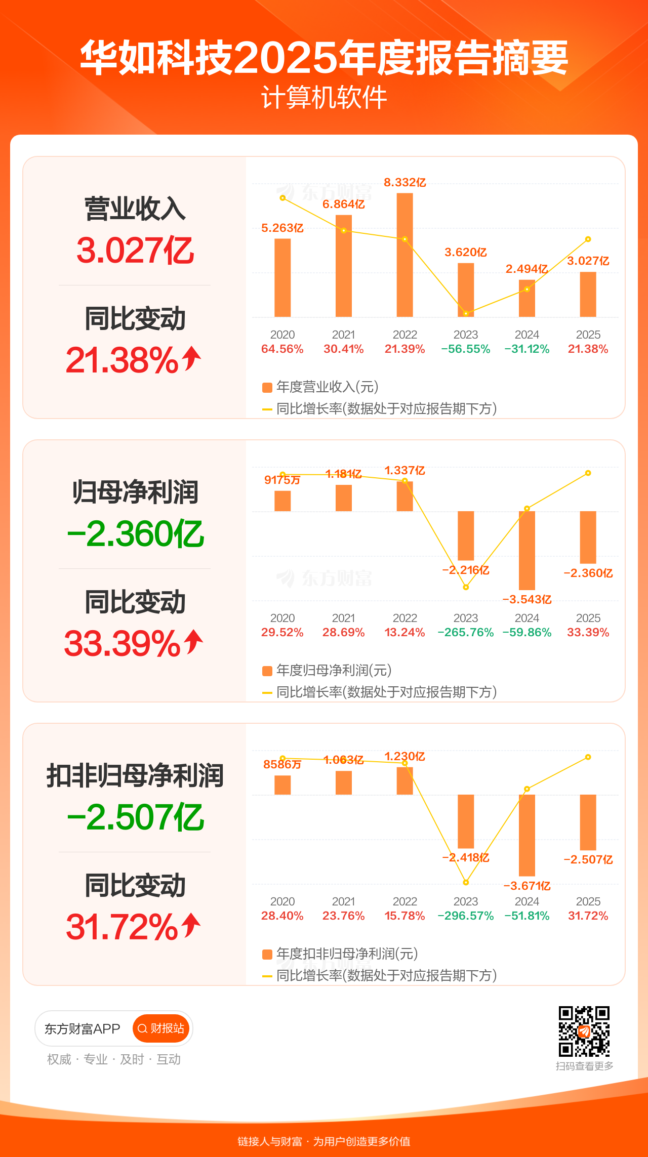 华如科技4月21日发布2025年年报显示,公司全年实现营业收入3.03亿元,同比增长21.38%;归母净利润-2.36亿元;扣非归母净利润-2.51亿元。