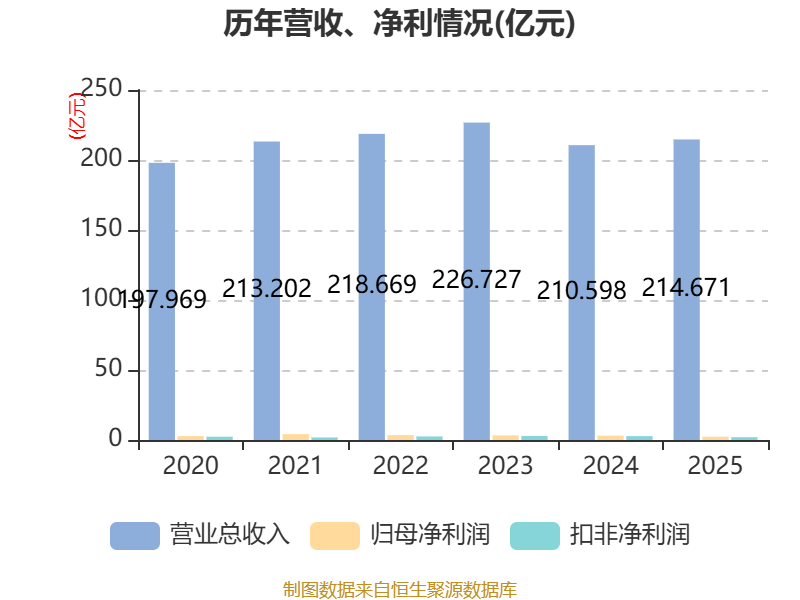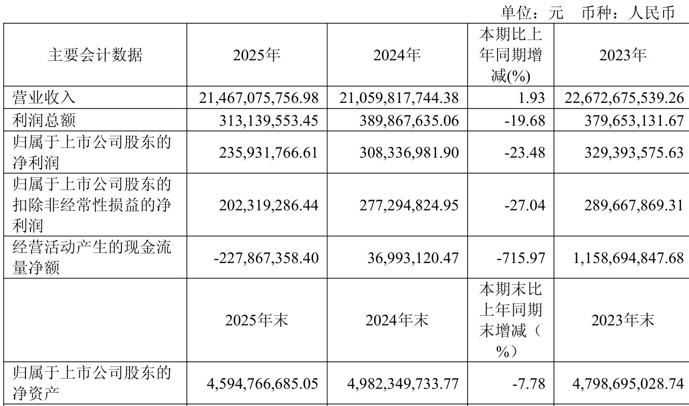 中证智能财讯宁波建工(601789)4月21日披露2025年年度报告。2025年,公司实现营业总收入214.67亿元,同比增长1.93%;归母净利润2.36亿元,同比下降23.48%;扣非净利润2.02亿元,同比下降27.04%;经营活动产生的现金流量净额为-2.28亿元,上年同期为3699.31万元;报告期内,宁波建工基本每股收益为0.2063元,加权平均净资产收益率为4.92%。公司2025年度分配预案为:拟向全体股东每10股派现0.5元(含税)。