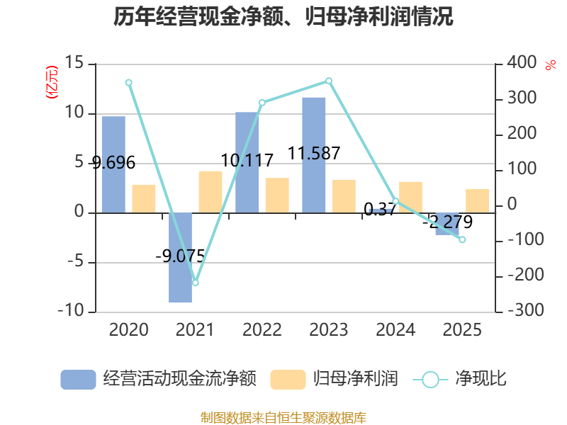 截至2025年,公司经营活动现金流净额为-2.28亿元,同比减少2.65亿元;筹资活动现金流净额4.22亿元,同比减少4.29亿元;投资活动现金流净额2050.11万元,上年同期为-6.51亿元。