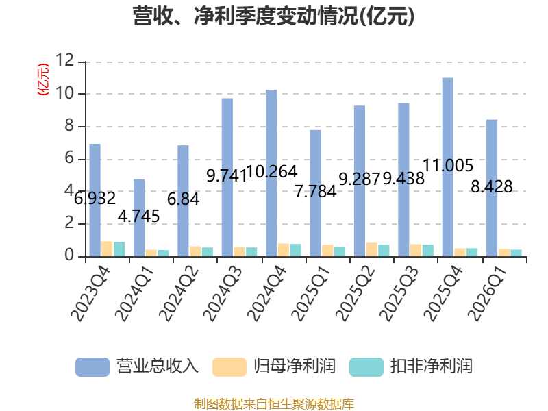 中证智能财讯硅宝科技(300019)4月21日披露2026年第一季度报告。公司实现营业总收入8.43亿元,同比增长8.27%;归母净利润4600.4万元,同比下降35.12%;扣非净利润4067.35万元,同比下降31.81%;经营活动产生的现金流量净额为-1.98亿元,上年同期为-1.11亿元;报告期内,硅宝科技基本每股收益为0.117元,加权平均净资产收益率为1.68%。