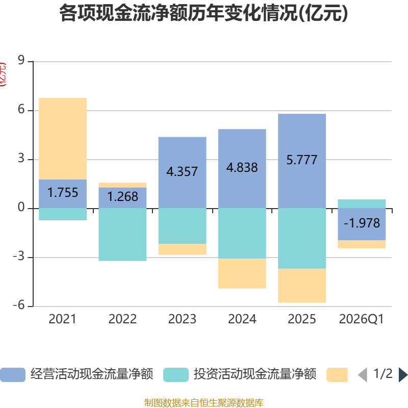 截至2026年一季度末,公司经营活动现金流净额为-1.98亿元,同比减少8702.28万元;筹资活动现金流净额-4872.16万元,同比减少1.45亿元;投资活动现金流净额5343.95万元,上年同期为-1.62亿元。