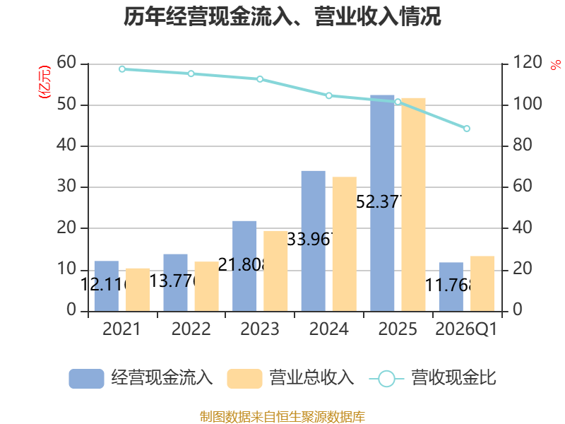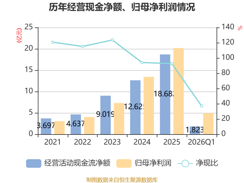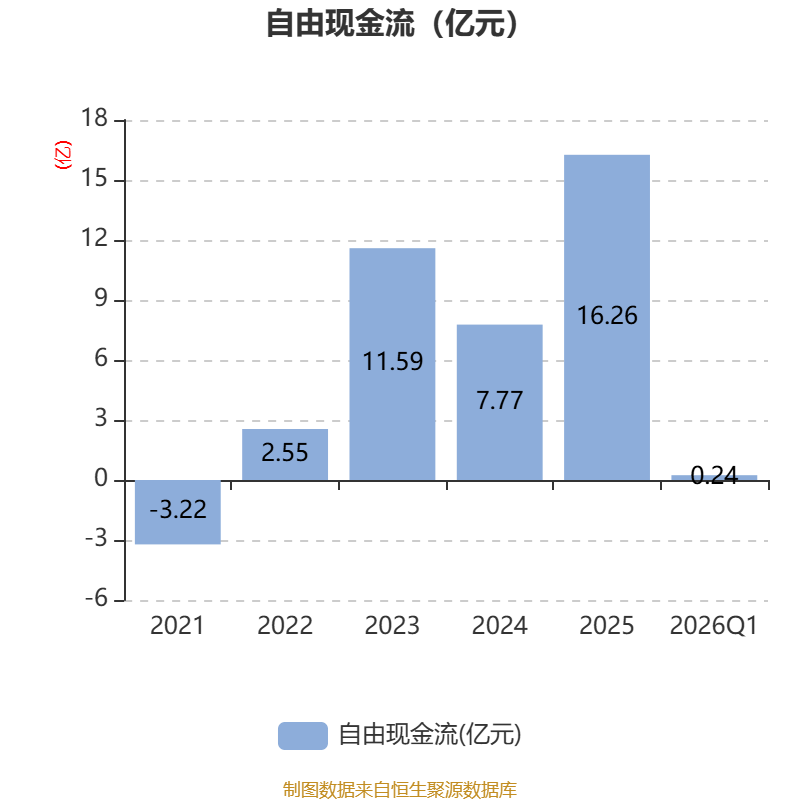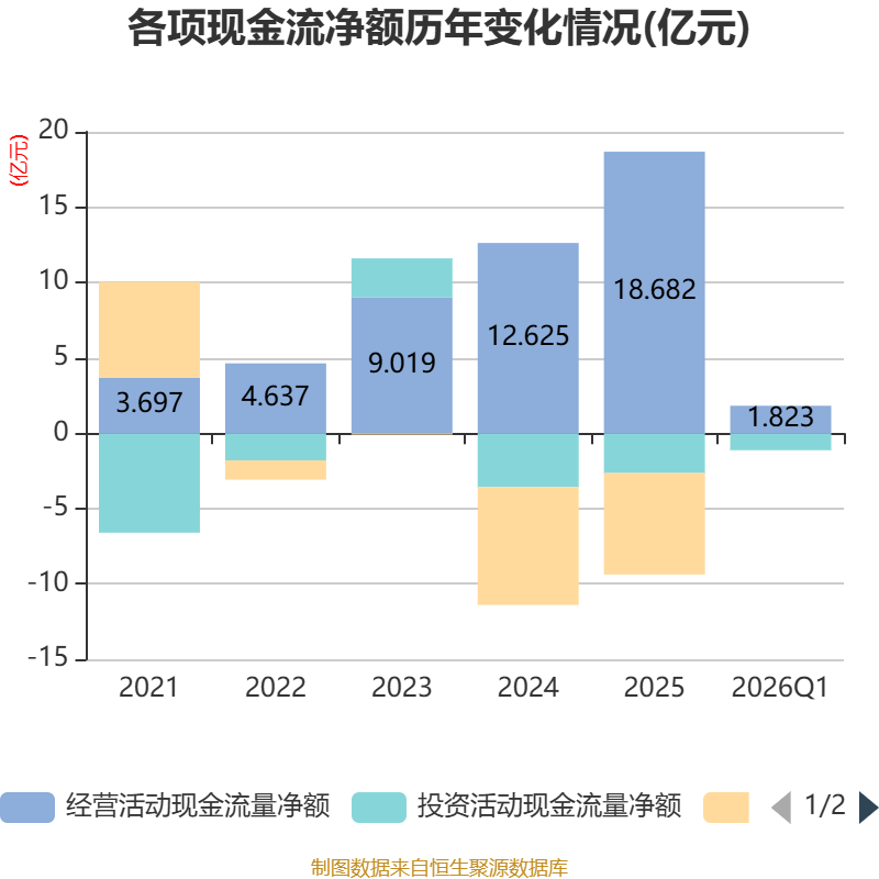 截至2026年一季度末,公司经营活动现金流净额为1.82亿元,同比下降37.92%;筹资活动现金流净额-6000元,同比增加32.4万元;投资活动现金流净额-1.13亿元,上年同期为-3.12亿元。