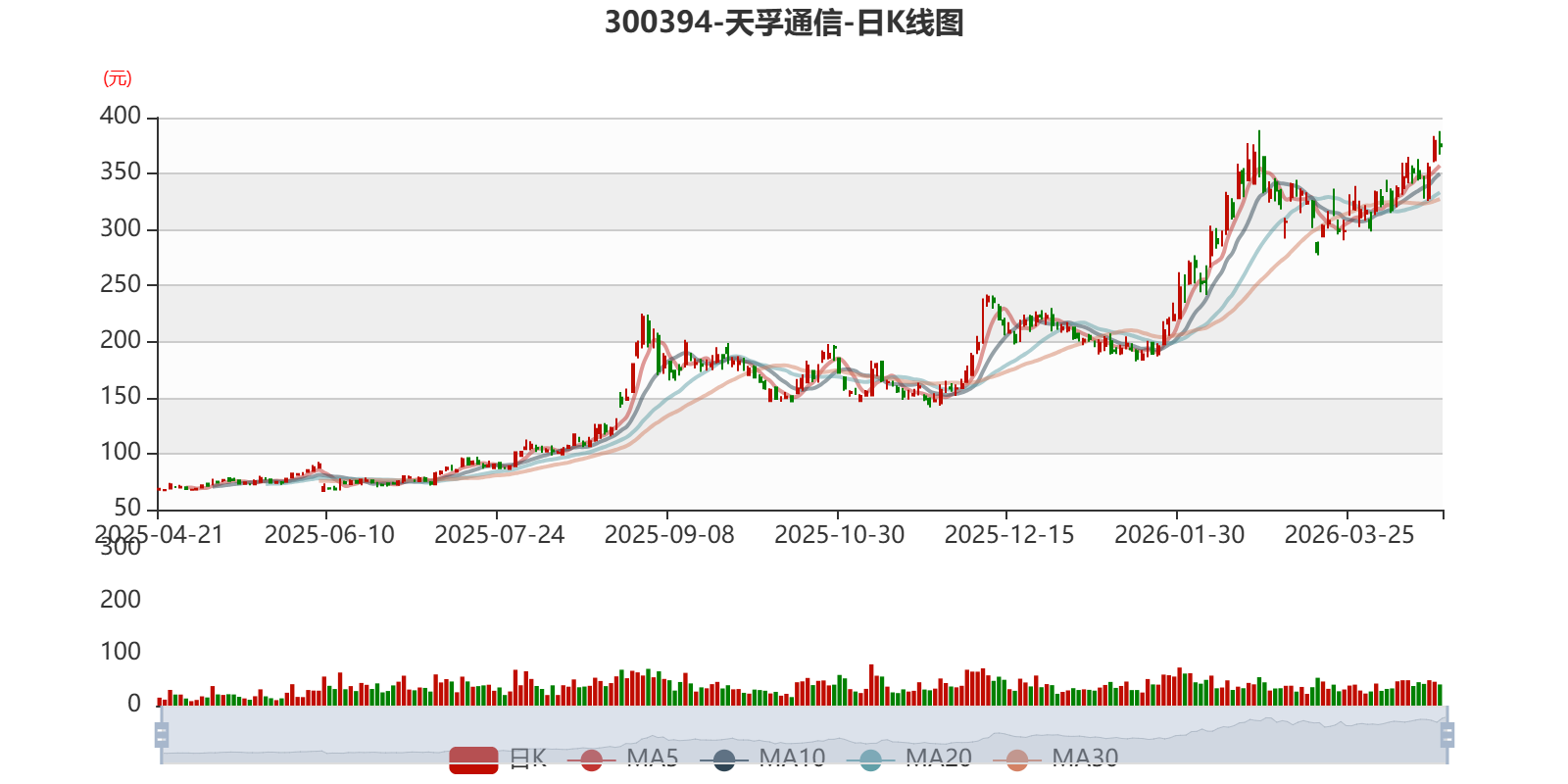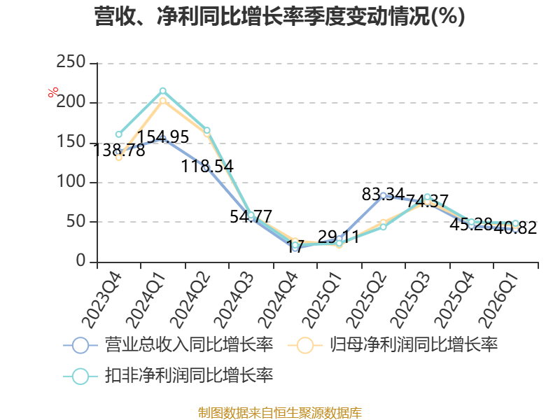 中证智能财讯天孚通信(300394)4月21日披露2026年第一季度报告。公司实现营业总收入13.3亿元,同比增长40.82%;归母净利润4.92亿元,同比增长45.79%;扣非净利润4.93亿元,同比增长48.44%;经营活动产生的现金流量净额为1.82亿元,同比下降37.92%;报告期内,天孚通信基本每股收益为0.6331元,加权平均净资产收益率为8.57%。