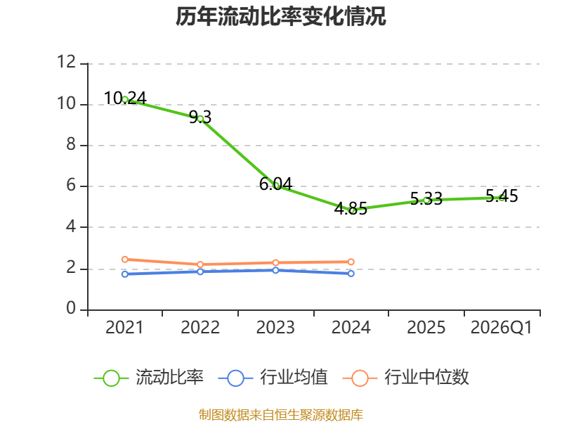 2026年第一季度,公司流动比率为5.45,速动比率为4.89。