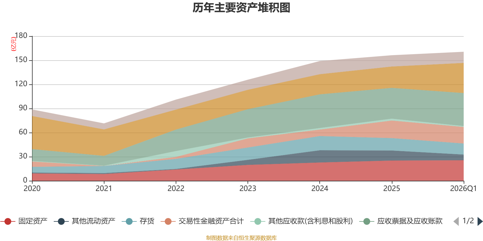 资产重大变化方面,截至2026年一季度末,公司货币资金较上年末增加41%,占公司总资产比重上升6.33个百分点;其他流动资产较上年末减少43.7%,占公司总资产比重下降3.6个百分点;存货较上年末减少10.52%,占公司总资产比重下降1.28个百分点;交易性金融资产合计较上年末减少6.12%,占公司总资产比重下降1.21个百分点。