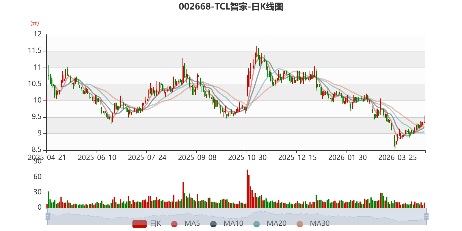 以4月20日收盘价计算,TCL智家目前市盈率(TTM)约为8.99倍,市净率(LF)约2.63倍,市销率(TTM)约0.54倍。