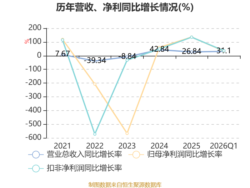负债重大变化方面,截至2026年一季度末,公司长期借款较上年末减少25.04%,占公司总资产比重下降2.11个百分点;短期借款较上年末增加22.21%,占公司总资产比重上升1.74个百分点;合同负债较上年末减少17.21%,占公司总资产比重下降1.48个百分点;一年内到期的非流动负债较上年末增加143.75%,占公司总资产比重上升1.32个百分点。