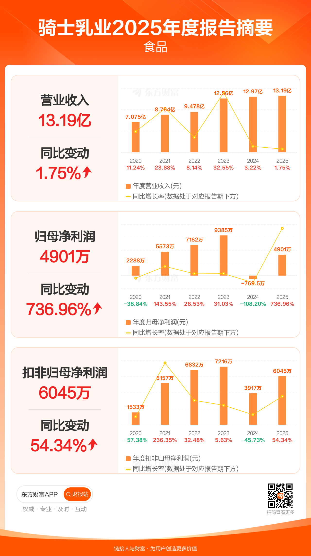 骑士乳业4月20日发布2025年年报显示,公司全年实现营业收入13.19亿元,同比增长1.75%;归母净利润4901.47万元,同比增长736.96%;扣非归母净利润6045.00万元,同比增长54.34%。