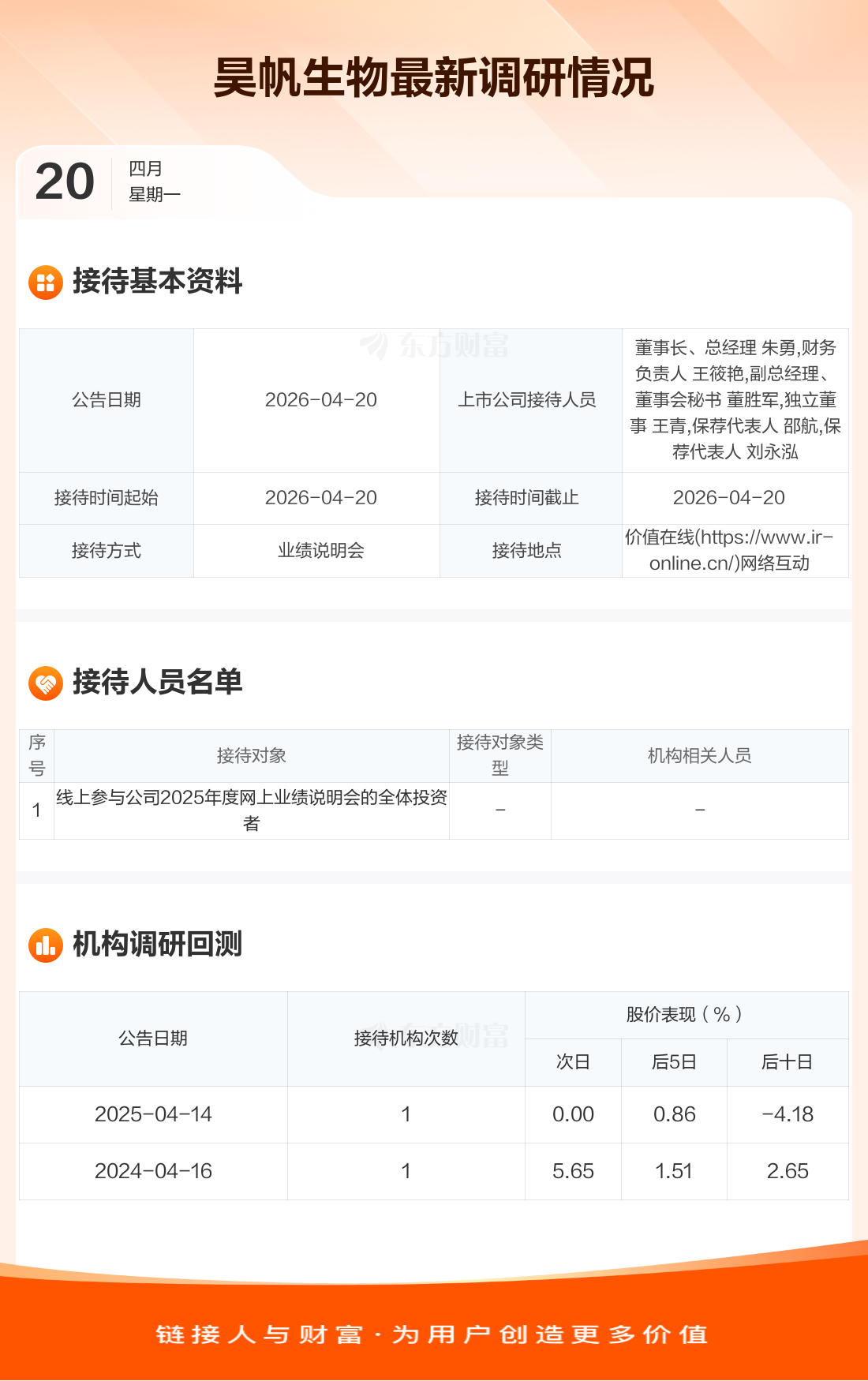 昊帆生物4月20日公告称,4月20日接待线上参与公司2025年度网上业绩说明会的全体投资者调研。接待人员包括董事长、总经理 朱勇,财务负责人 王筱艳,副总经理、董事会秘书 董胜军,独立董事 王青,保荐代表人 邵航,保荐代表人 刘永泓。