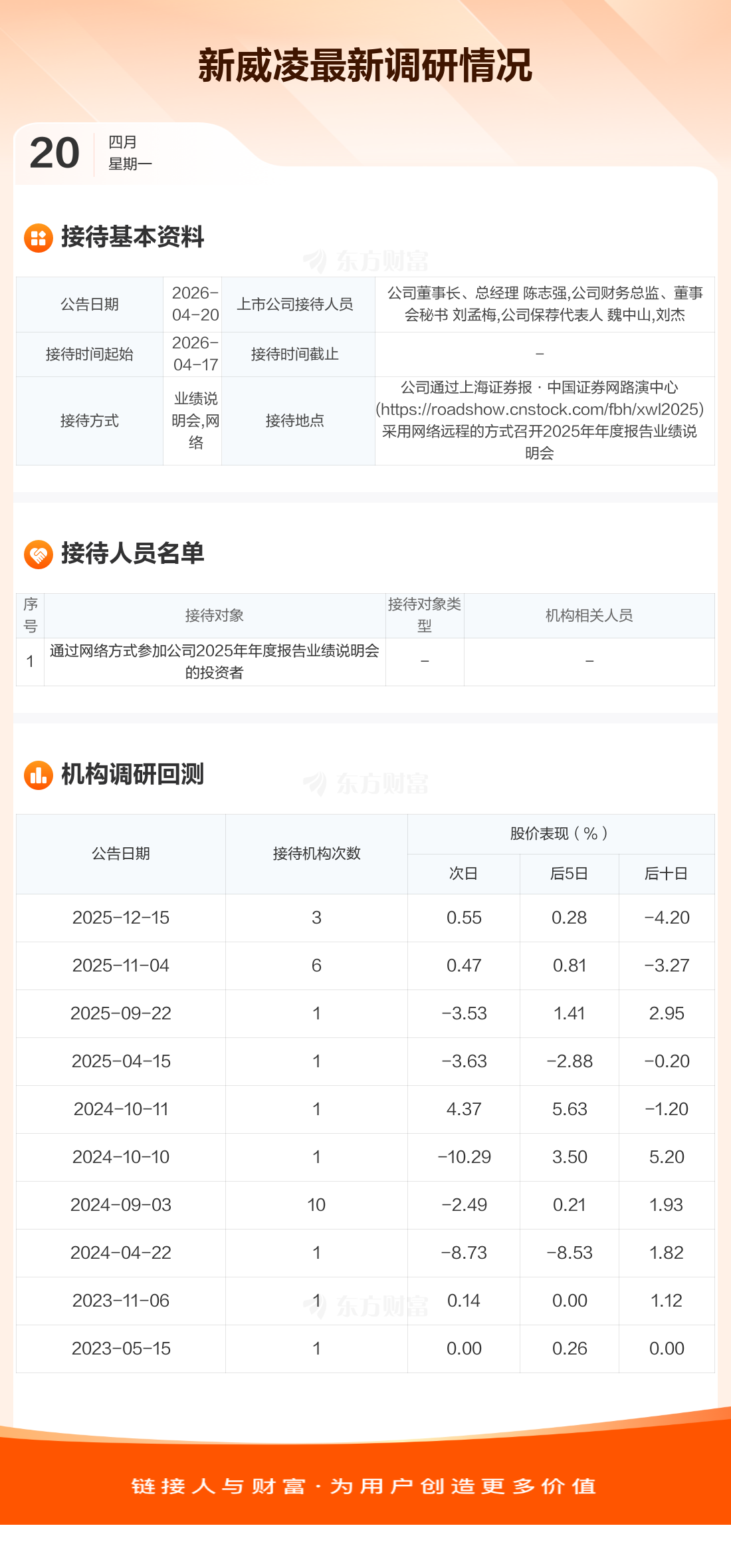 新威凌4月20日公告称,4月17日接待通过网络方式参加公司2025年年度报告业绩说明会的投资者调研。接待人员包括公司董事长、总经理 陈志强,公司财务总监、董事会秘书 刘孟梅,公司保荐代表人 魏中山,刘杰。