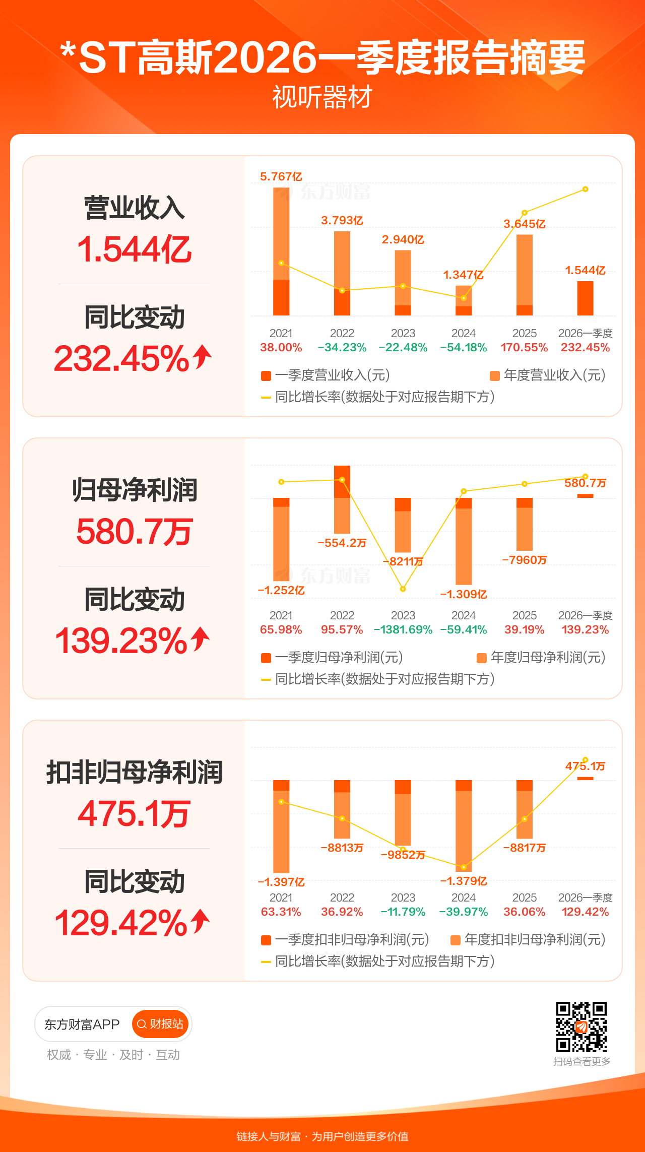 *ST高斯4月21日发布2026年一季报显示,公司一季度实现营业收入1.54亿元,同比增长232.45%;归母净利润580.66万元,同比增长139.23%;扣非归母净利润475.11万元,同比增长129.42%。