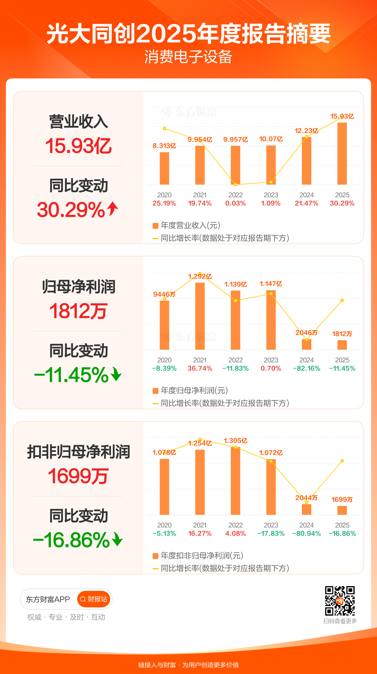 光大同创4月21日发布2025年年报显示,公司全年实现营业收入15.93亿元,同比增长30.29%;归母净利润1811.70万元,同比下滑11.45%;扣非归母净利润1699.47万元,同比下滑16.86%。