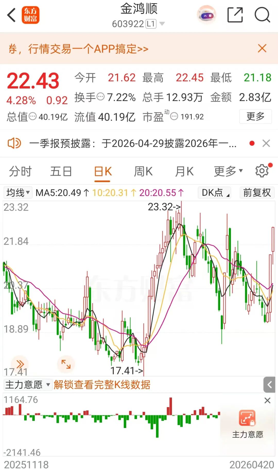 不过金鸿顺近日股价表现较为活跃。4月17日,公司股价实现涨停;4月20日,股价上涨4.28%,至22.43元/股,总市值为40.19亿元。