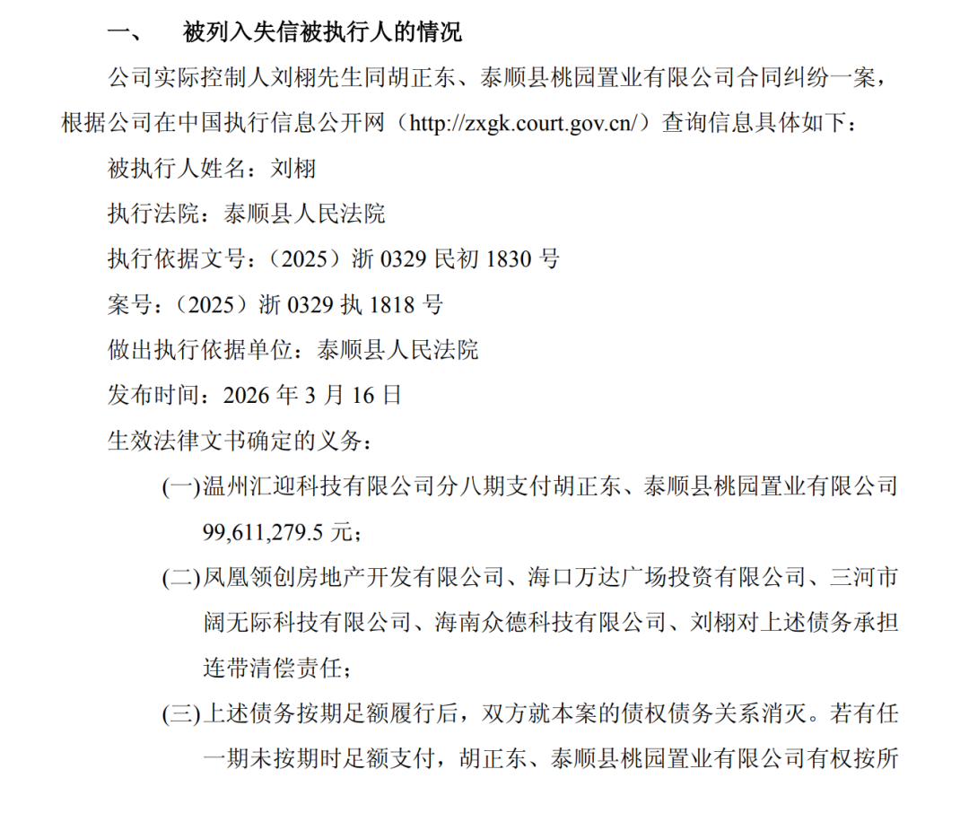 刘栩需对温州汇迎科技有限公司9961.13万元债务承担连带清偿责任,且全部未履行,同时被采取限制高消费措施,其控制的众德科技亦同步被“限高”。